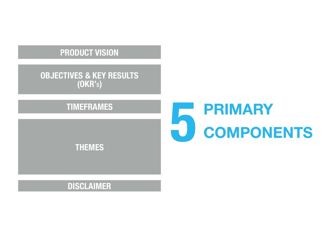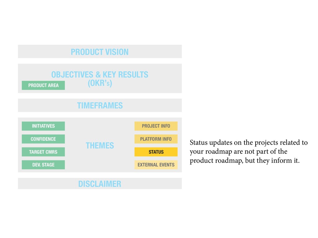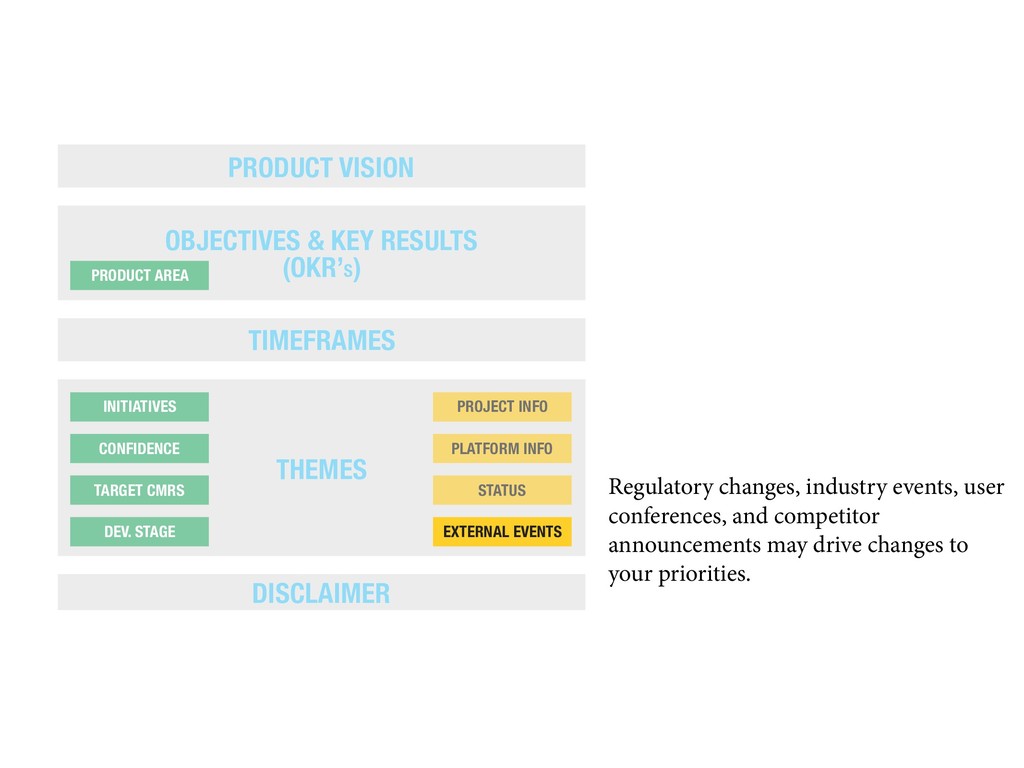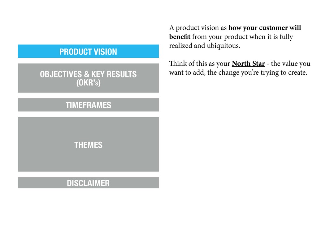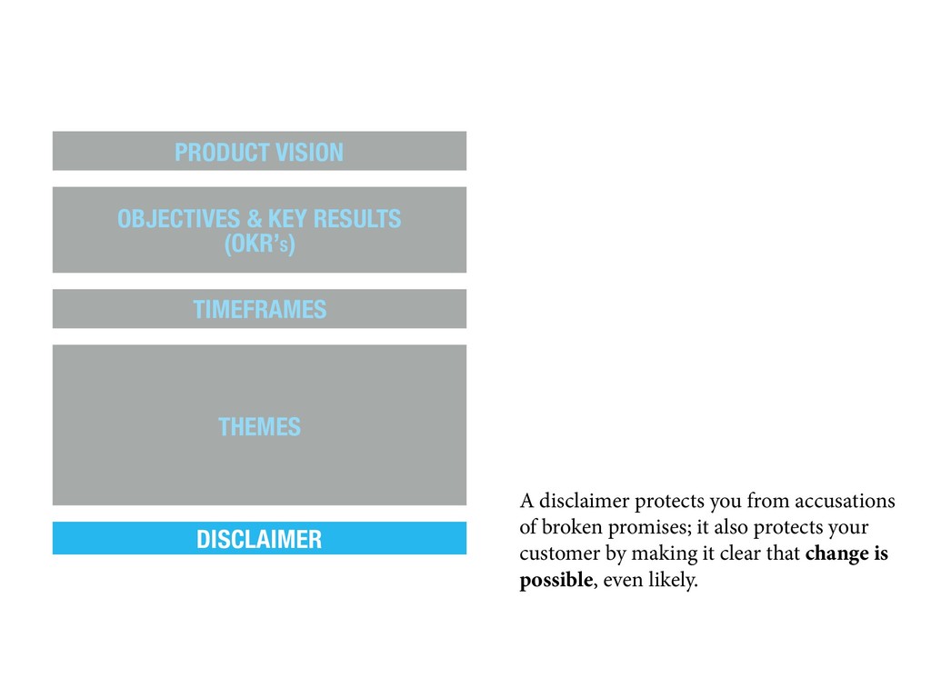 also protects your customer by making it clear that change is possible, even likely. PRODUCT VISION OBJECTIVES & KEY RESULTS (OKR’S) TIMEFRAMES THEMES DISCLAIMER