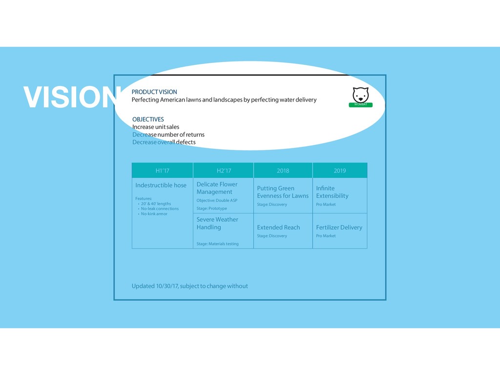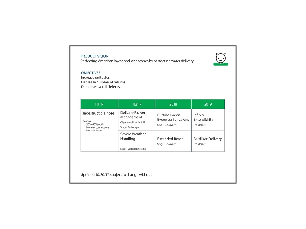 40’ lengths • No-leak connections • No-kink armor Delicate Flower Management Objective: Double ASP Stage: Prototype Putting Green Evenness for Lawns Stage: Discovery Infinite Extensibility Pro Market Severe Weather Handling Stage: Materials testing Extended Reach Stage: Discovery Fertilizer Delivery Pro Market OBJECTIVES Increase unit sales Decrease number of returns Decrease overall defects PRODUCT VISION Perfecting American lawns and landscapes by perfecting water delivery Updated 10/30/17, subject to change without WOMBAT VISION
