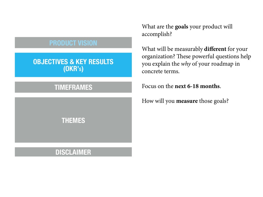 be measurably different for your organization? These powerful questions help you explain the why of your roadmap in concrete terms. Focus on the next 6-18 months. How will you measure those goals? PRODUCT VISION OBJECTIVES & KEY RESULTS (OKR’S) TIMEFRAMES THEMES DISCLAIMER