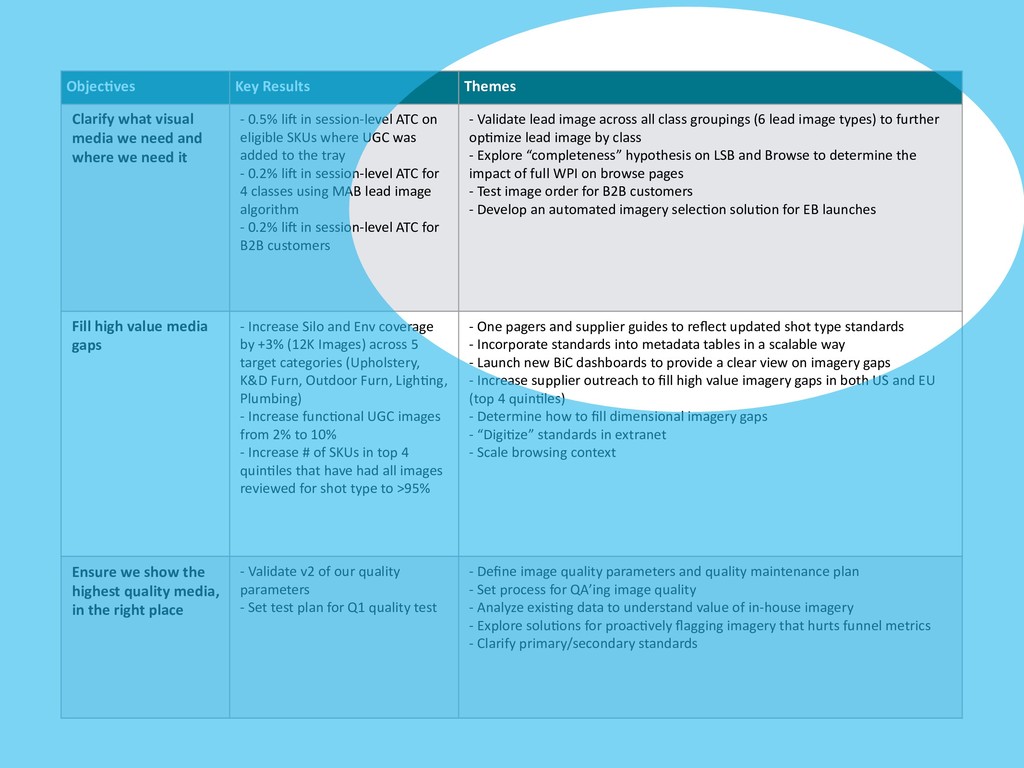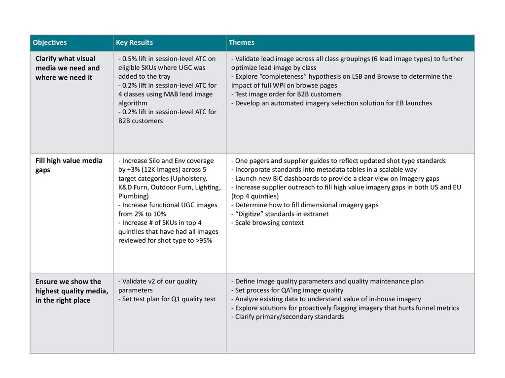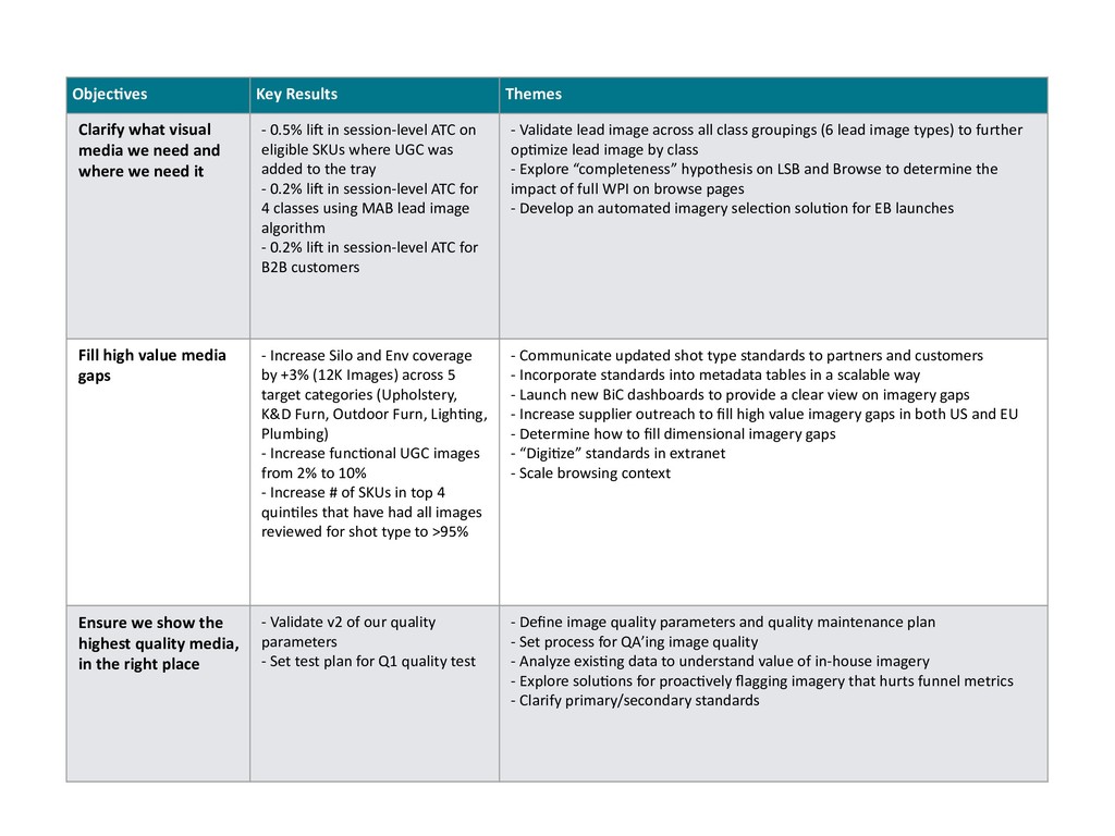 and where we need it - 0.5% li) in session-level ATC on eligible SKUs where UGC was added to the tray - 0.2% li) in session-level ATC for 4 classes using MAB lead image algorithm - 0.2% li) in session-level ATC for B2B customers - Validate lead image across all class groupings (6 lead image types) to further opLmize lead image by class - Explore “completeness” hypothesis on LSB and Browse to determine the impact of full WPI on browse pages - Develop an automated imagery selecLon soluLon for EB launches Fill high value media gaps - Increase Silo and Env coverage by +3% (12K Images) across 5 target categories (Upholstery, K&D Furn, Outdoor Furn, LighLng, Plumbing) - Increase funcLonal UGC images from 2% to 10% - Increase # of SKUs in top 4 quinLles that have had all images reviewed for shot type to >95% - Communicate updated shot type standards to partners and customers - Incorporate standards into metadata tables in a scalable way - Launch new BiC dashboards to provide a clear view on imagery gaps - Increase supplier outreach to fill high value imagery gaps in both US and EU - Determine how to fill dimensional imagery gaps - “DigiLze” standards in extranet - Scale browsing context Ensure we show the highest quality media, in the right place - Validate v2 of our quality parameters - Set test plan for Q1 quality test - Define image quality parameters and quality maintenance plan - Set process for QA’ing image quality - Analyze exisLng data to understand value of in-house imagery - Explore soluLons for proacLvely flagging imagery that hurts funnel metrics - Clarify primary/secondary standards