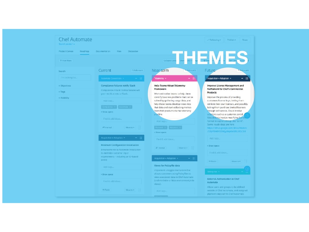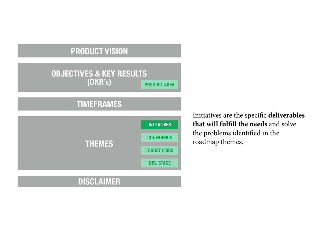 in guiding the development of solutions. The key problems customers face form the themes at the heart of the roadmap. Written as ambiguous and somewhat undefined. PRODUCT VISION OBJECTIVES & KEY RESULTS (OKR’S) TIMEFRAMES THEMES DISCLAIMER