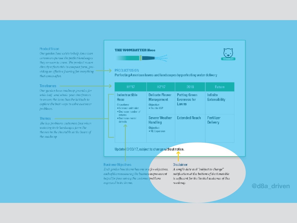 40’ lengths • No-leak connections • No-kink armor Delicate Flower Management Objective: Double ASP Stage: Prototype Putting Green Evenness for Lawns Stage: Discovery Infinite Extensibility Pro Market Severe Weather Handling Stage: Materials testing Extended Reach Stage: Discovery Fertilizer Delivery Pro Market OBJECTIVES Increase unit sales Decrease number of returns Decrease overall defects PRODUCT VISION Perfecting American lawns and landscapes by perfecting water delivery Updated 10/30/17, subject to change without WOMBAT