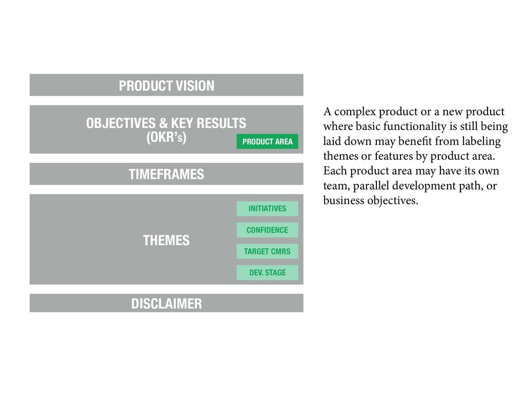 PRODUCT AREA INITIATIVES CONFIDENCE TARGET CMRS DEV. STAGE A complex product or a new product where basic functionality is still being laid down may benefit from labeling themes or features by product area. Each product area may have its own team, parallel development path, or business objectives.