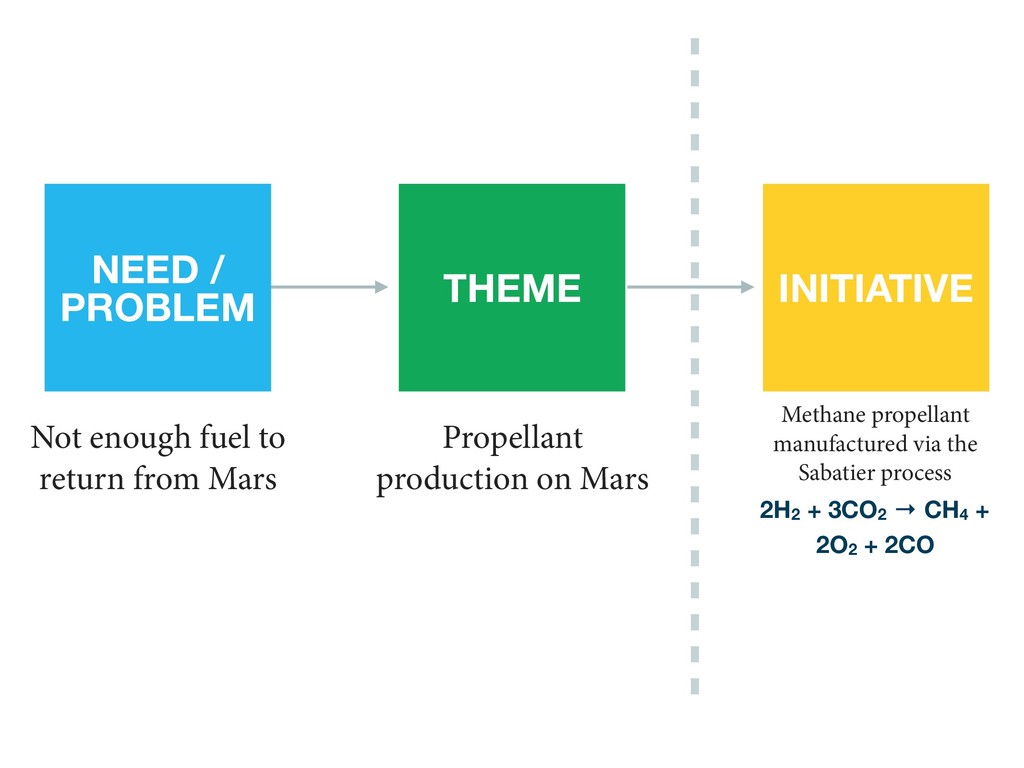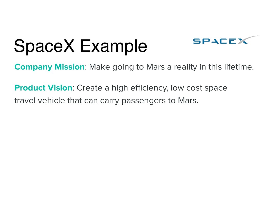 SPACE-X Company Mission: Make going to Mars a reality in this lifetime. Product Vision: Create a high efficiency, low cost space travel vehicle that can seat multiple civilian passengers. Objective: Reducing the cost of space travel to what an average American family can afford. Key Result: Get cost for travel to Mars under $200,000.