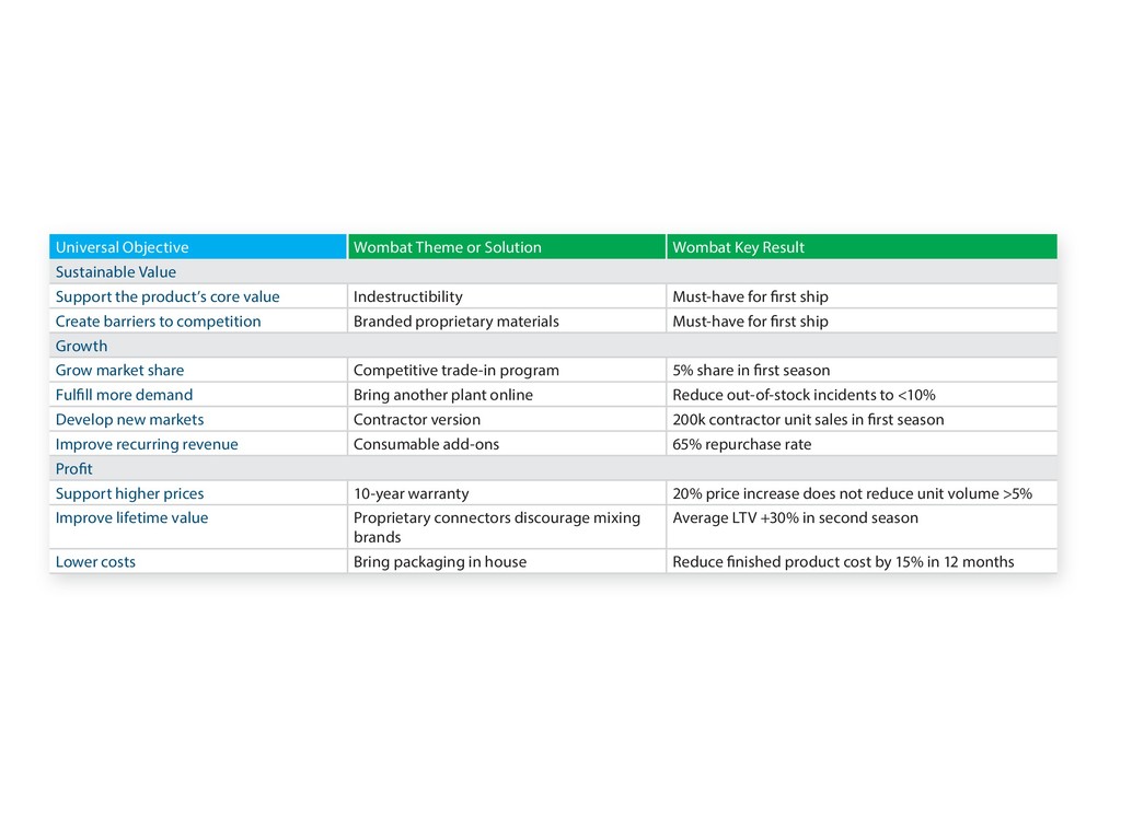 Value Support the product’s core value Indestructibility Must-have for first ship Create barriers to competition Branded proprietary materials Must-have for first ship Growth Grow market share Competitive trade-in program 5% share in first season Fulfill more demand Bring another plant online Reduce out-of-stock incidents to <10% Develop new markets Contractor version 200k contractor unit sales in first season Improve recurring revenue Consumable add-ons 65% repurchase rate Profit Support higher prices 10-year warranty 20% price increase does not reduce unit volume >5% Improve lifetime value Proprietary connectors discourage mixing brands Average LTV +30% in second season Lower costs Bring packaging in house Reduce finished product cost by 15% in 12 months Table 4-1. The 10 Universal Business Objectives
