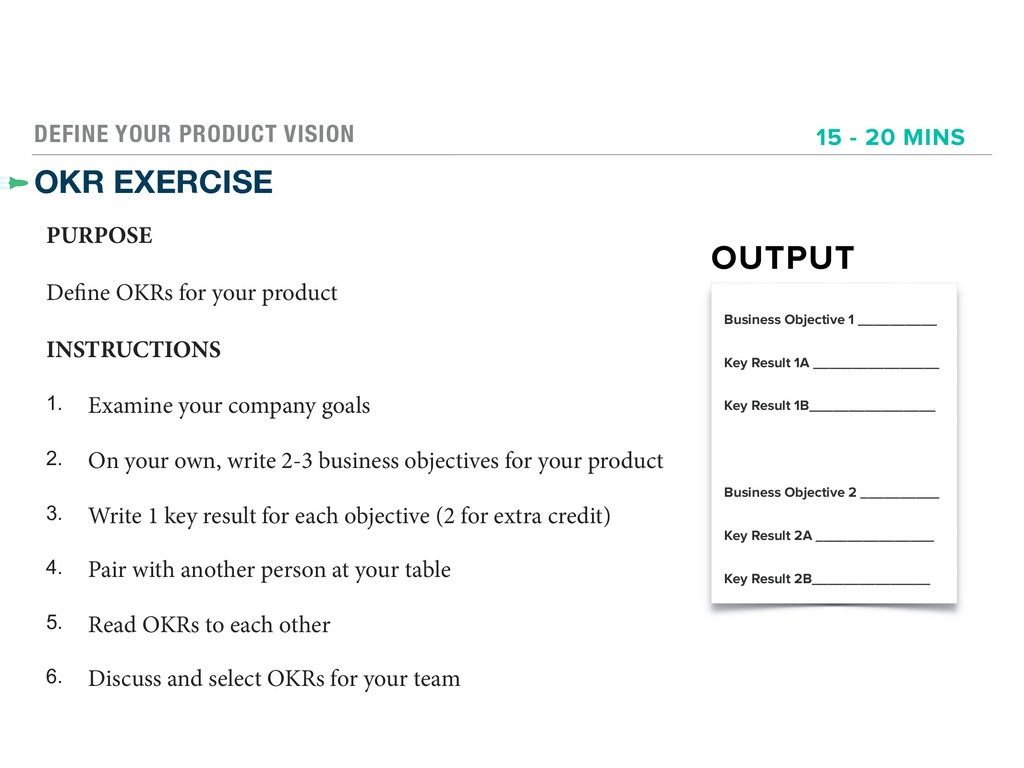 your product INSTRUCTIONS 1. Examine your company goals 2. On your own, write 2-3 business objectives for your product 3. Write 1 key result for each objective (2 for extra credit) 4. Pair with another person at your table 5. Read OKRs to each other 6. Discuss and select OKRs for your team OUTPUT Business Objective 1 __________ Key Result 1A ________________ Key Result 1B________________ Business Objective 2 __________ Key Result 2A _______________ Key Result 2B_______________ 15 - 20 MINS
