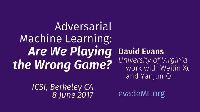 Machine learning classifiers are increasingly popular for security applications, and often achieve outstanding performance in testing. When deployed, however, classifiers can be thwarted by motivated adversaries who adaptively construct adversarial examples that exploit flaws in the classifier's model. Much work on adversarial examples, including Carlini and Wagner’s attacks which are the best results to date, has focused on finding small distortions to inputs that fool a classifier. Previous defenses have been both ineffective and very expensive in practice. In this talk, I'll describe a new very simple strategy, feature squeezing, that can be used to harden classifiers by detecting adversarial examples. Feature squeezing reduces the search space available to an adversary by coalescing samples that correspond to many different inputs in the original space into a single sample. Adversarial examples can be detected by comparing the model's predictions on the original and squeezed sample. In practice, of course, adversaries are not limited to small distortions in a particular metric space. Indeed, it may be possible to make large changes to an input without losing its intended malicious behavior. We have developed an evolutionary framework to search for such adversarial examples, and demonstrated that it can automatically find evasive variants against state-of-the-art classifiers. This suggests that work on adversarial machine learning needs a better definition of adversarial examples, and to make progress towards understanding how classifiers and oracles perceive samples differently.