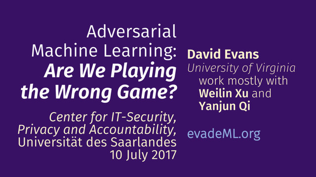 Evans University of Virginia work mostly with Weilin Xu and Yanjun Qi evadeML.org Center for IT-Security, Privacy and Accountability, Universität des Saarlandes 10 July 2017