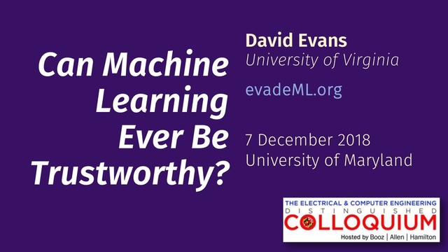 information theoretic, resource bounded required System Security !"%! capabilities, motivations, rationality common Adversarial Machine Learning !&; !"#* artificially limited adversary making progress! 117 Huge gaps to close: threat models are unrealistic (but real threats unclear) verification techniques only work for tiny models experimental defenses often (quickly) broken