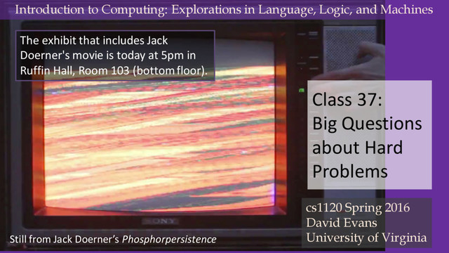 Explorations in Language, Logic, and Machines cs1120 Spring 2016 David Evans University of Virginia Still from Jack Doerner’s Phosphorpersistence The exhibit that includes Jack Doerner's movie is today at 5pm in Ruffin Hall, Room 103 (bottom floor).