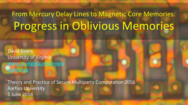 Oblivious Memories David Evans University of Virginia www.cs.virginia.edu/evans oblivc.org Theory and Practice of Secure Multiparty Computation 2016 Aarhus University 1 June 2016