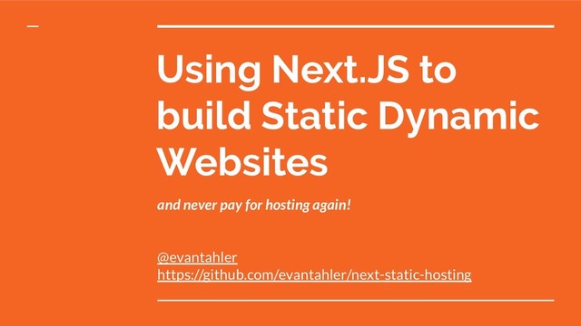 Next.js is a static & dynamic site rendering tool for websites based on React. We can use Next.js to flatten and build static sites for us using React. We can then upload these packs to Github Pages for a freely hosted website. This talk will focus less on the React part of things, and more on the "devops" tools we use to build and host the site - Next, Circle.CI, and Github Pages