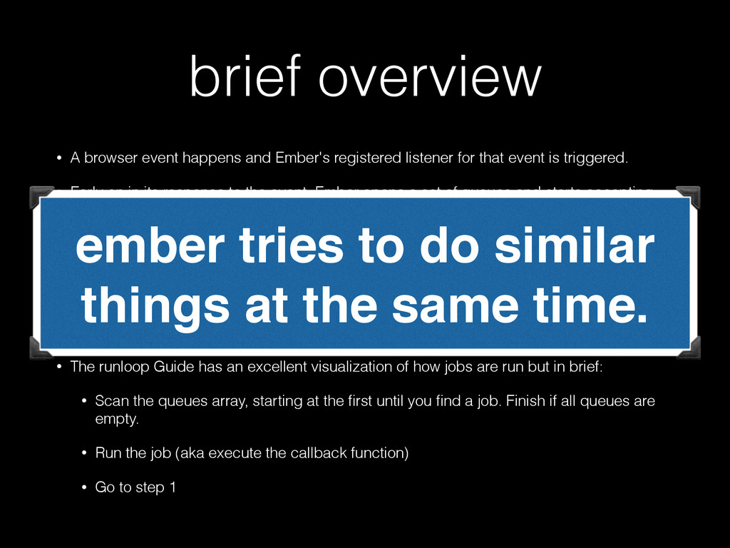 listener for that event is triggered. • Early on in its response to the event, Ember opens a set of queues and starts accepting jobs. • As Ember works its way through your application code, it continues to schedule jobs on the queues. • Near the end of its response to the event Ember closes the queue-set and starts running jobs on the queues. Scheduled jobs can themselves still add jobs to the queues even though we have closed them to other code. • The runloop Guide has an excellent visualization of how jobs are run but in brief: • Scan the queues array, starting at the first until you find a job. Finish if all queues are empty. • Run the job (aka execute the callback function) • Go to step 1 ember tries to do similar! things at the same time.