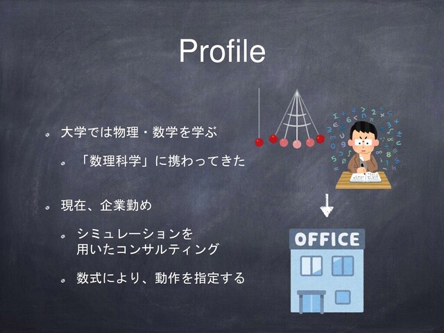 Profile 大学では物理・数学を学ぶ 「数理科学」に携わってきた 現在、企業勤め シミュレーションを 用いたコンサルティング 数式により、動作を指定する