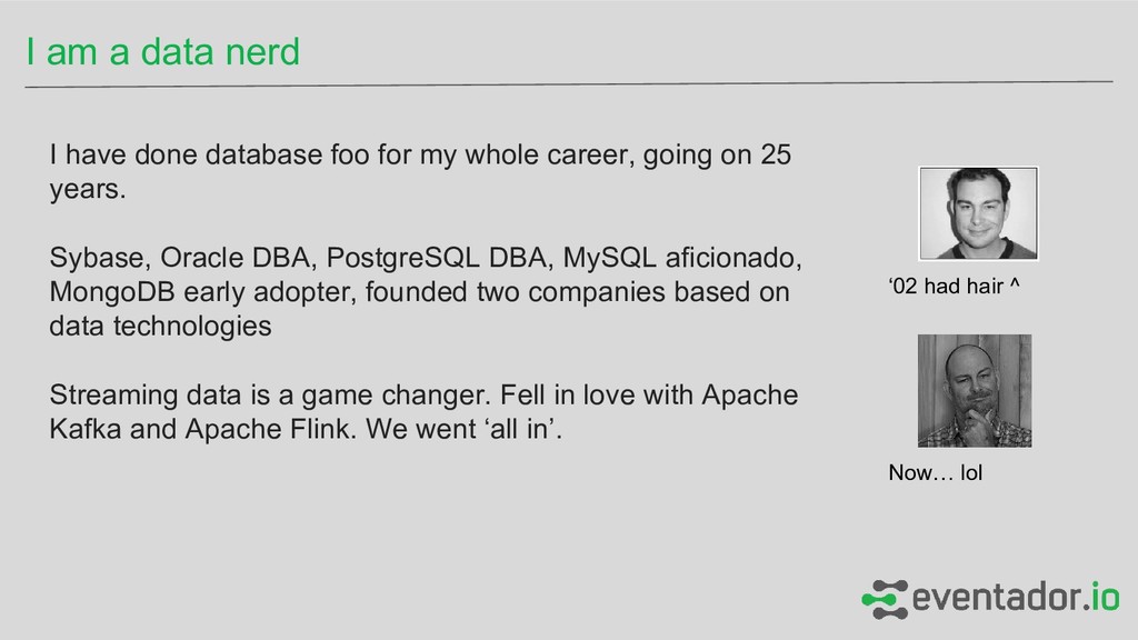on 25 years. Sybase, Oracle DBA, PostgreSQL DBA, MySQL aficionado, MongoDB early adopter, founded two companies based on data technologies Streaming data is a game changer. Fell in love with Apache Kafka and Apache Flink. We went ‘all in’. I am a data nerd ‘02 had hair ^ Now… lol