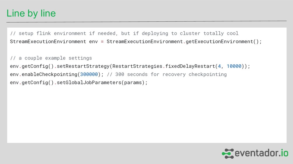 if deploying to cluster totally cool StreamExecutionEnvironment env = StreamExecutionEnvironment.getExecutionEnvironment(); // a couple example settings env.getConfig().setRestartStrategy(RestartStrategies.fixedDelayRestart(4, 10000)); env.enableCheckpointing(300000); // 300 seconds for recovery checkpointing env.getConfig().setGlobalJobParameters(params);