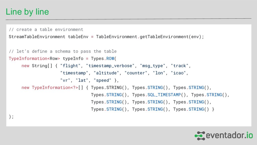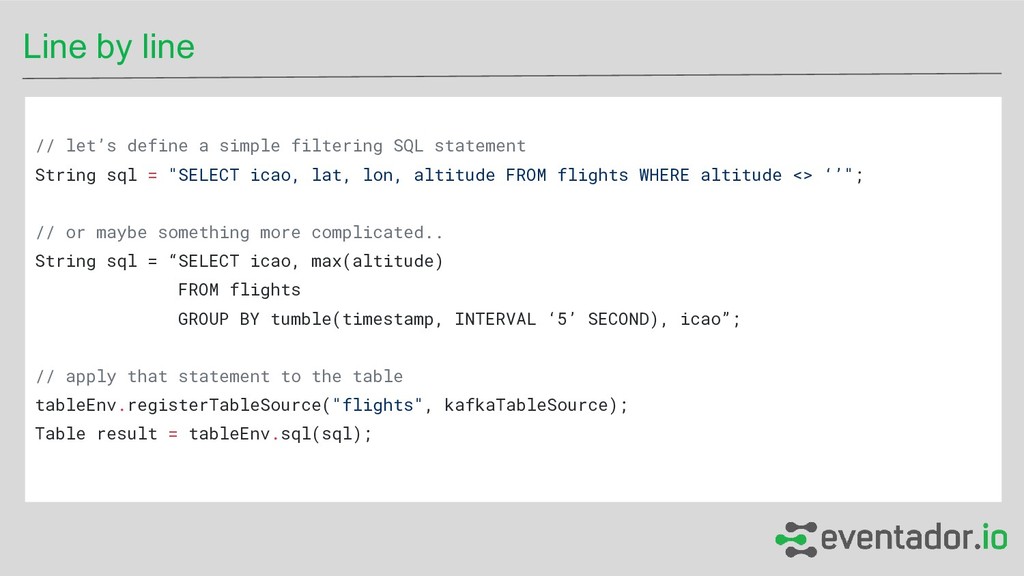 statement String sql = "SELECT icao, lat, lon, altitude FROM flights WHERE altitude <> ‘’"; // or maybe something more complicated.. String sql = “SELECT icao, max(altitude) FROM flights GROUP BY tumble(timestamp, INTERVAL ‘5’ SECOND), icao”; // apply that statement to the table tableEnv.registerTableSource("flights", kafkaTableSource); Table result = tableEnv.sql(sql);