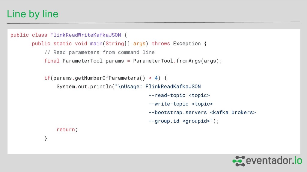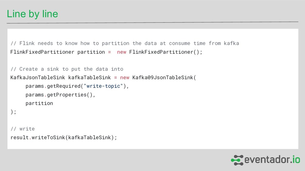 partition the data at consume time from kafka FlinkFixedPartitioner partition = new FlinkFixedPartitioner(); // Create a sink to put the data into KafkaJsonTableSink kafkaTableSink = new Kafka09JsonTableSink( params.getRequired("write-topic"), params.getProperties(), partition ); // write result.writeToSink(kafkaTableSink);
