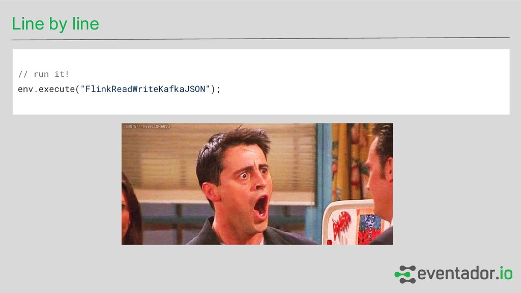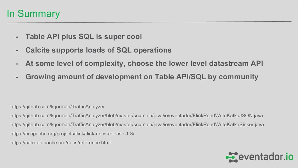- Calcite supports loads of SQL operations - At some level of complexity, choose the lower level datastream API - Growing amount of development on Table API/SQL by community https://github.com/kgorman/TrafficAnalyzer https://github.com/kgorman/TrafficAnalyzer/blob/master/src/main/java/io/eventador/FlinkReadWriteKafkaJSON.java https://github.com/kgorman/TrafficAnalyzer/blob/master/src/main/java/io/eventador/FlinkReadWriteKafkaSinker.java https://ci.apache.org/projects/flink/flink-docs-release-1.3/ https://calcite.apache.org/docs/reference.html