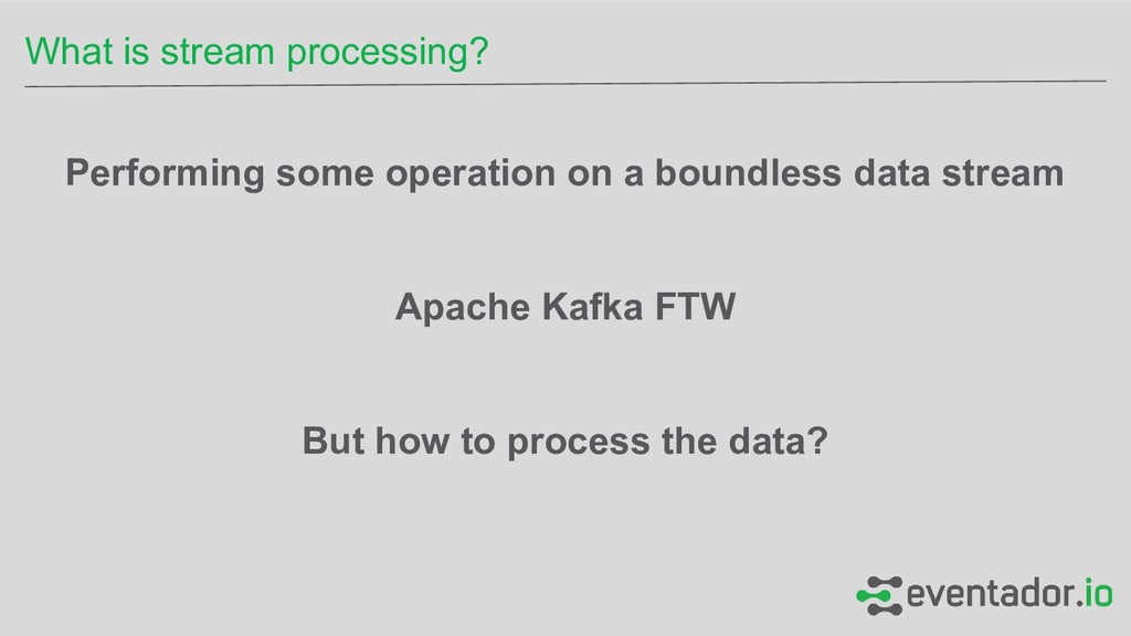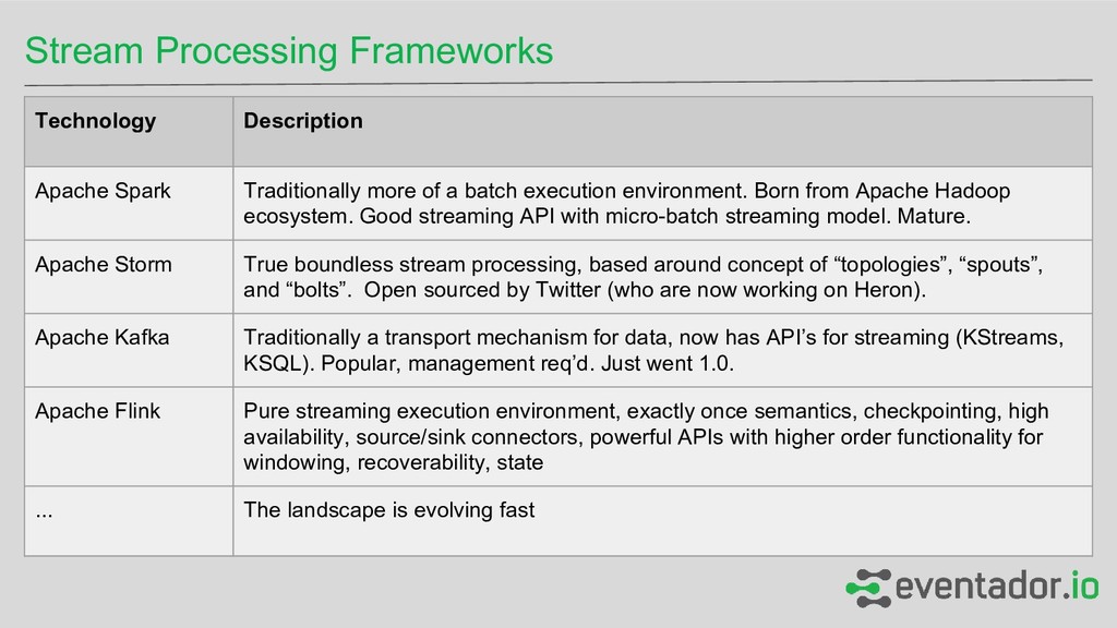 a batch execution environment. Born from Apache Hadoop ecosystem. Good streaming API with micro-batch streaming model. Mature. Apache Storm True boundless stream processing, based around concept of “topologies”, “spouts”, and “bolts”. Open sourced by Twitter (who are now working on Heron). Apache Kafka Traditionally a transport mechanism for data, now has API’s for streaming (KStreams, KSQL). Popular, management req’d. Just went 1.0. Apache Flink Pure streaming execution environment, exactly once semantics, checkpointing, high availability, source/sink connectors, powerful APIs with higher order functionality for windowing, recoverability, state ... The landscape is evolving fast