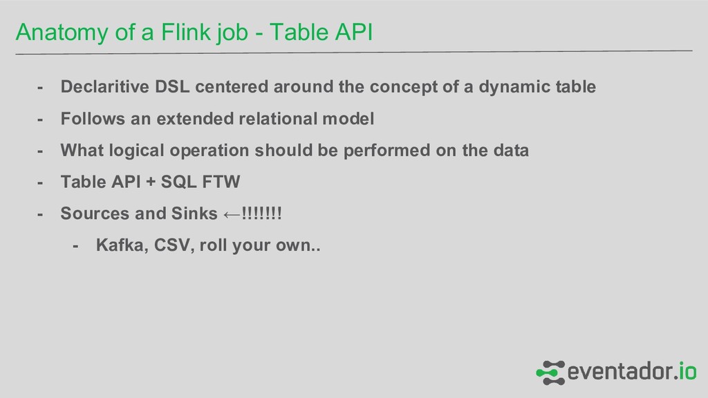 DSL centered around the concept of a dynamic table - Follows an extended relational model - What logical operation should be performed on the data - Table API + SQL FTW - Sources and Sinks ←!!!!!!! - Kafka, CSV, roll your own..