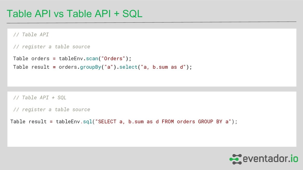 // register a table source Table orders = tableEnv.scan("Orders"); Table result = orders.groupBy("a").select("a, b.sum as d"); // Table API + SQL // register a table source Table result = tableEnv.sql("SELECT a, b.sum as d FROM orders GROUP BY a");