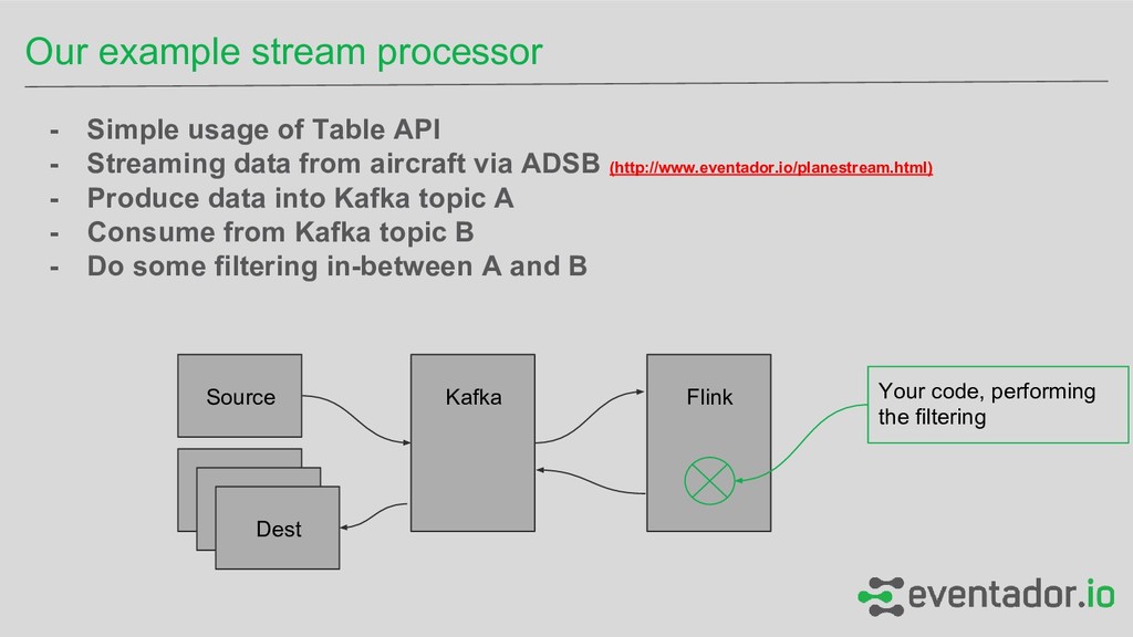 - Streaming data from aircraft via ADSB (http://www.eventador.io/planestream.html) - Produce data into Kafka topic A - Consume from Kafka topic B - Do some filtering in-between A and B Kafka Source Flink Dest Dest Dest Your code, performing the filtering