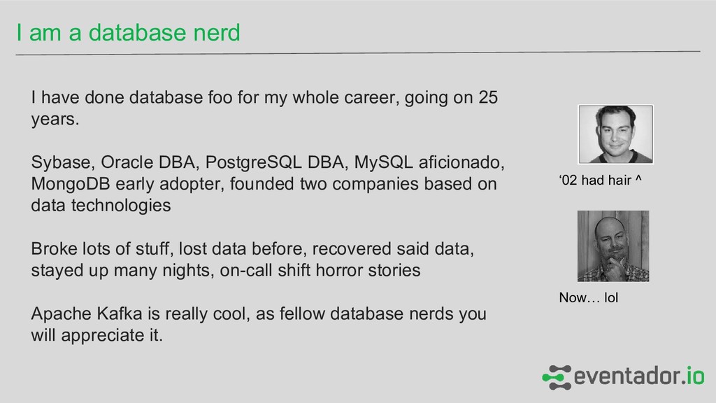 on 25 years. Sybase, Oracle DBA, PostgreSQL DBA, MySQL aficionado, MongoDB early adopter, founded two companies based on data technologies Broke lots of stuff, lost data before, recovered said data, stayed up many nights, on-call shift horror stories Apache Kafka is really cool, as fellow database nerds you will appreciate it. I am a database nerd ‘02 had hair ^ Now… lol