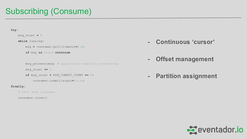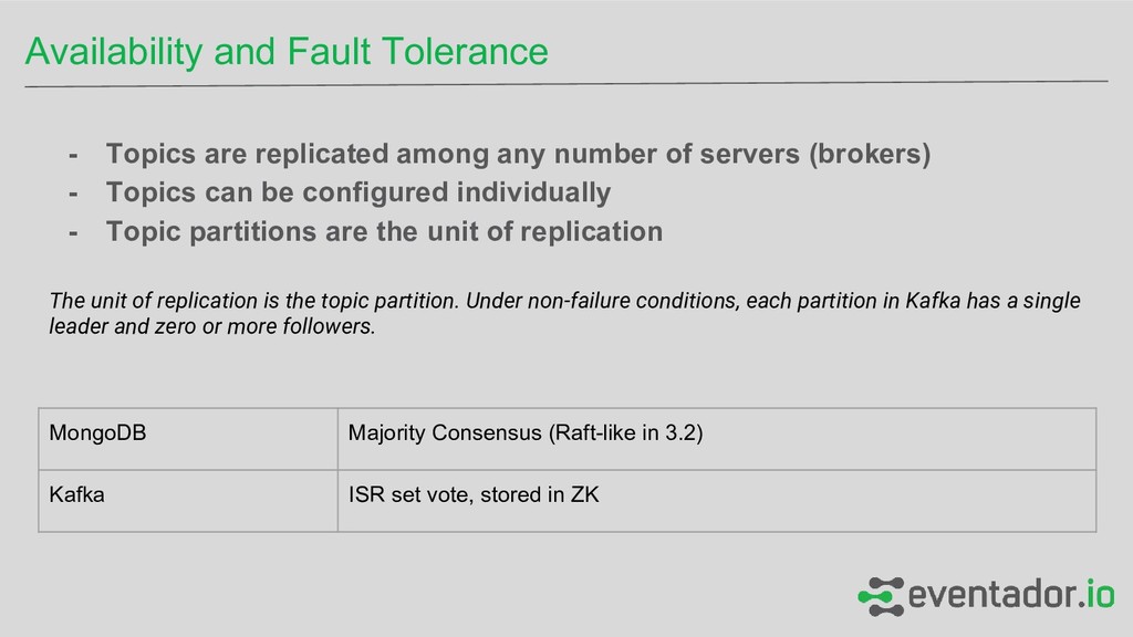 - Topics can be configured individually - Topic partitions are the unit of replication The unit of replication is the topic partition. Under non-failure conditions, each partition in Kafka has a single leader and zero or more followers. Availability and Fault Tolerance MongoDB Majority Consensus (Raft-like in 3.2) Kafka ISR set vote, stored in ZK