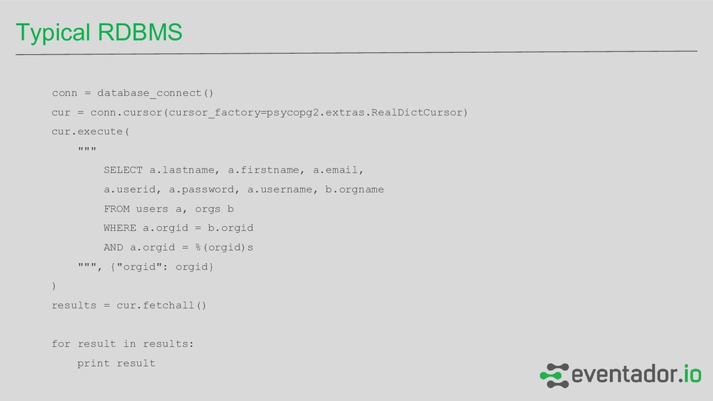 a.firstname, a.email, a.userid, a.password, a.username, b.orgname FROM users a, orgs b WHERE a.orgid = b.orgid AND a.orgid = %(orgid)s """, {"orgid": orgid} ) results = cur.fetchall() for result in results: print result Typical RDBMS