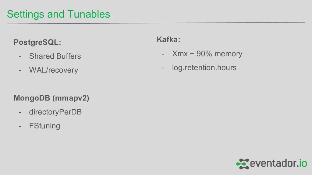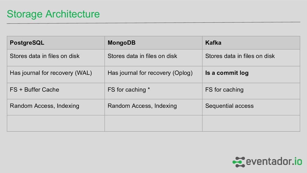 disk Stores data in files on disk Stores data in files on disk Has journal for recovery (WAL) Has journal for recovery (Oplog) Is a commit log FS + Buffer Cache FS for caching * FS for caching Random Access, Indexing Random Access, Indexing Sequential access