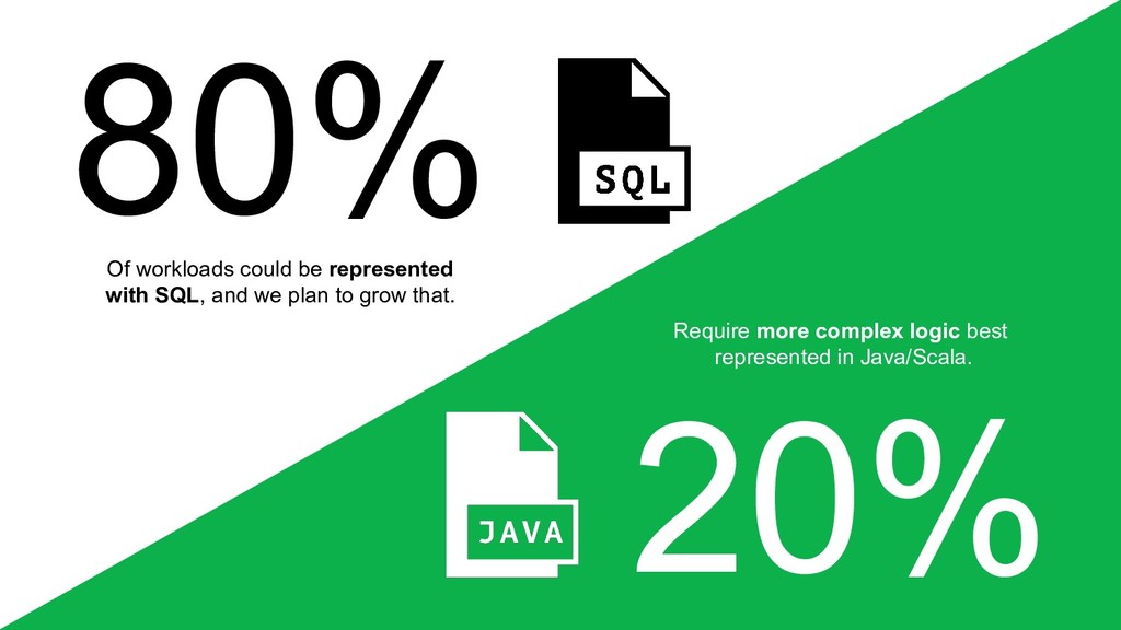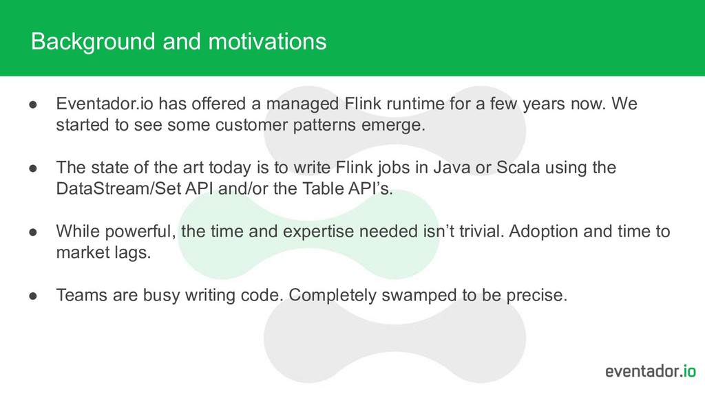 runtime for a few years now. We started to see some customer patterns emerge. • The state of the art today is to write Flink jobs in Java or Scala using the DataStream/Set API and/or the Table API’s. • While powerful, the time and expertise needed isn’t trivial. Adoption and time to market lags. • Teams are busy writing code. Completely swamped to be precise.