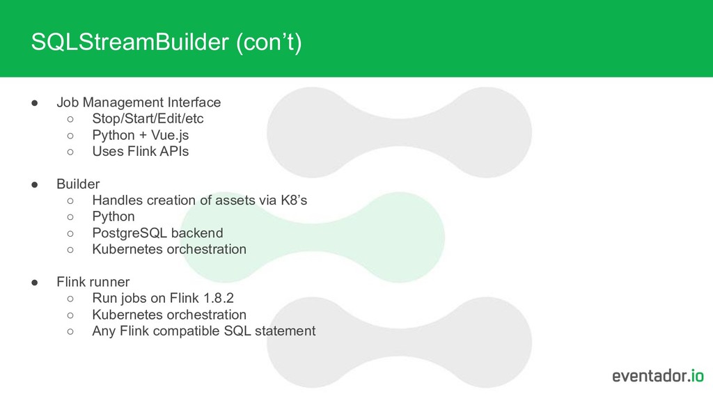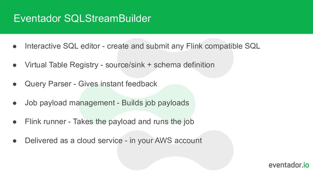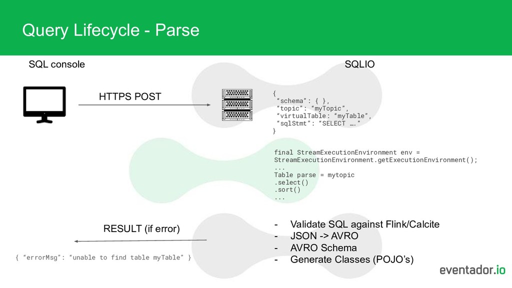 console Column Column Column Value Value Value - If class exists - class, method, params .connect( new Kafka() .version("0.11") .topic("...") .sinkPartitionerXX result.writeToSink(..); env.execute(..); - Enhanced schema typing - Enhanced feedback/logging - Sends base64 encoded payload to Flink Job SAMPLE THE DATA TO USER