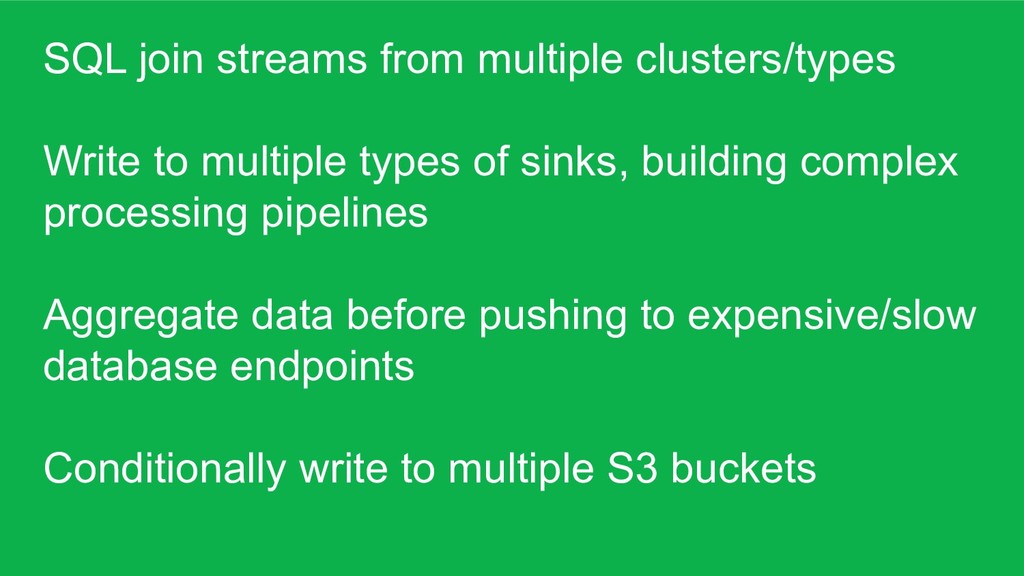 of sinks, building complex processing pipelines Aggregate data before pushing to expensive/slow database endpoints Conditionally write to multiple S3 buckets