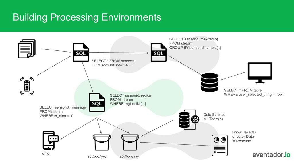 ... SELECT sensorid, max(temp) FROM stream GROUP BY sensorid, tumble(..) SELECT sensorid, region FROM stream WHERE region IN [...] s3://xxx/yyy s3://xxx/yyy sms SELECT * FROM table WHERE user_selected_thing = ‘foo’; SELECT sensorid, message FROM stream WHERE is_alert = ‘t’ Data Science ML Team(s) SnowFlakeDB or other Data Warehouse