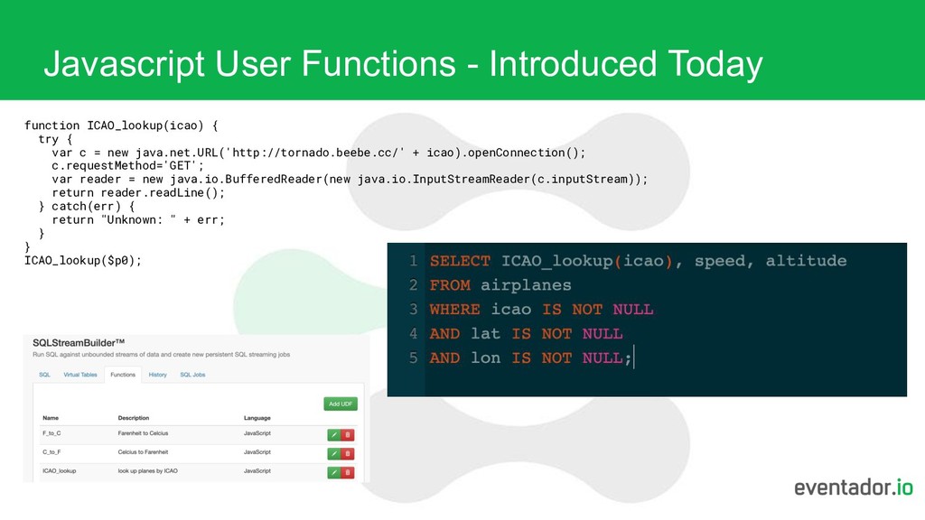 It’s massively useful for inspecting and reasoning about data. Everyone knows SQL. • It’s declarative, just ask for what you want to see. • It’s been extended to accommodate streaming constructs like windows (Flink/Calcite). • Streaming SQL never completes, it’s a query on boundless data. • It’s an amazing way to interact with streaming data.