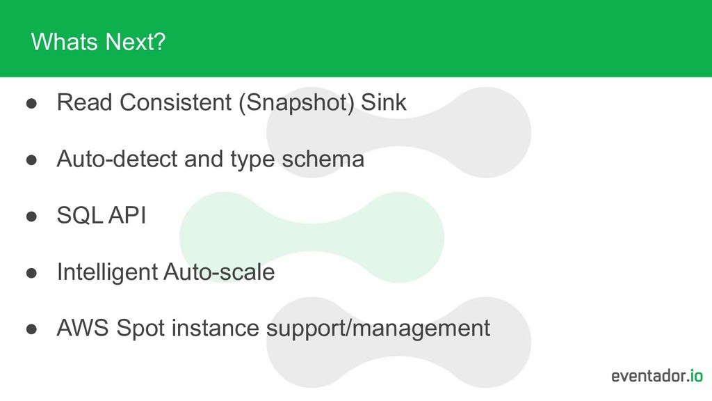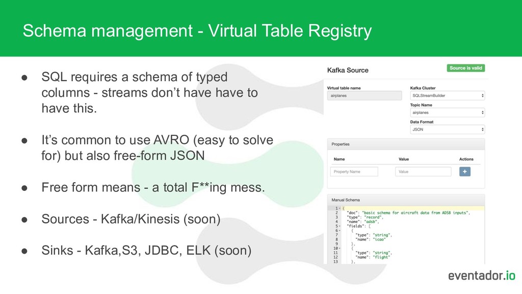 schema of typed columns - streams don’t have have to have this. • It’s common to use AVRO (easy to solve for) but also free-form JSON • Free form means - a total F**ing mess. • Sources - Kafka/Kinesis (soon) • Sinks - Kafka,S3, JDBC, ELK (soon)