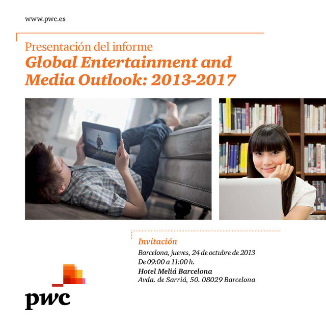 más de ti que tú de él? Tu negocio podría ser irrelevante dentro de 5 años... ¿Estás gestionando ese riesgo? Innovación o extinción. ¿Está preparada tu organización para afrontar los cambios de los próximos 5 años? PwC tiene el placer de invitarle a la presentación del informe Global Entertainment and Media Outlook 2013-2017, que analiza la evolución en el sector de Medios y Entretenimiento. Esta decimocuarta edición incluye un análisis completo de los segmentos esenciales de la industria, y desarrolla las previsiones a cinco años en las principales regiones del mercado mundial, siendo un referente de información en el sector. Como cada año, esperamos contar con tu presencia en este foro, que se ha convertido ya en punto de encuentro ineludible para los profesionales de la industria. Las nuevas formas de pensar pagan dividendos... ¿Estás invirtiendo adecuadamente?