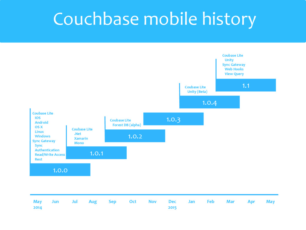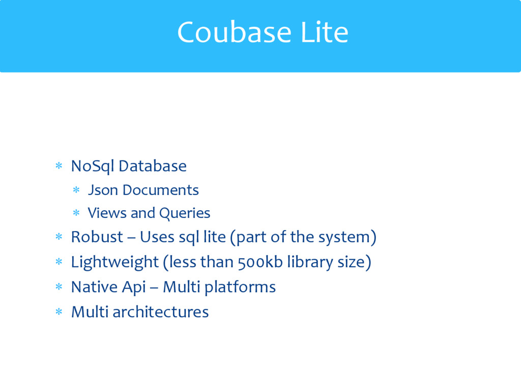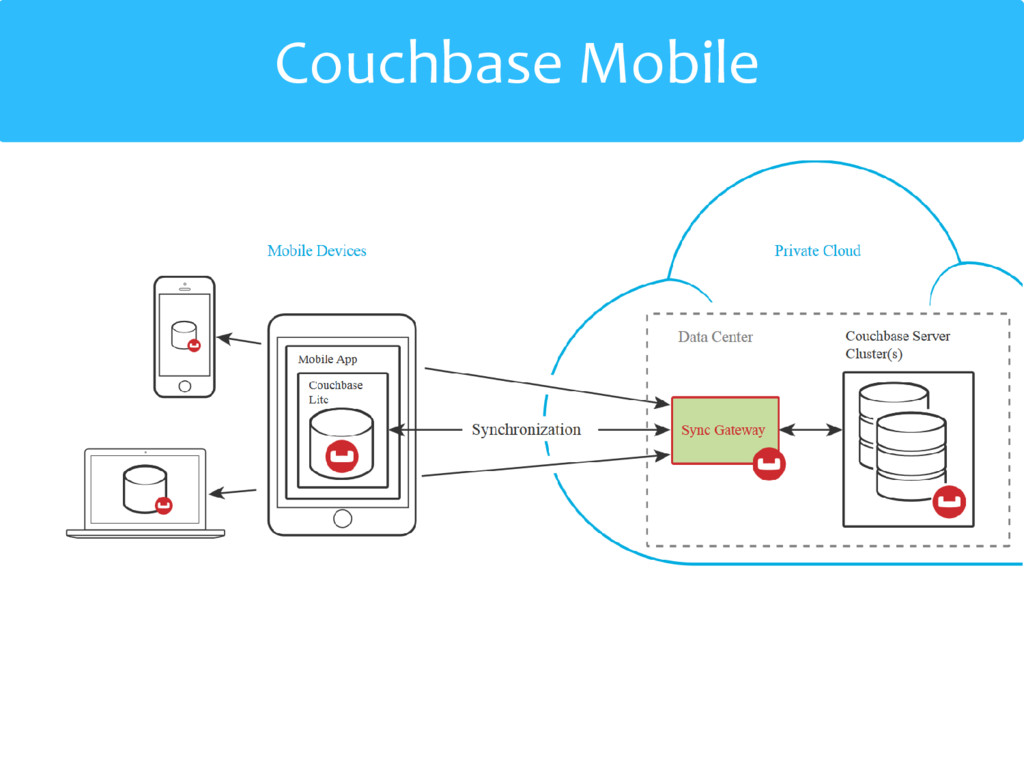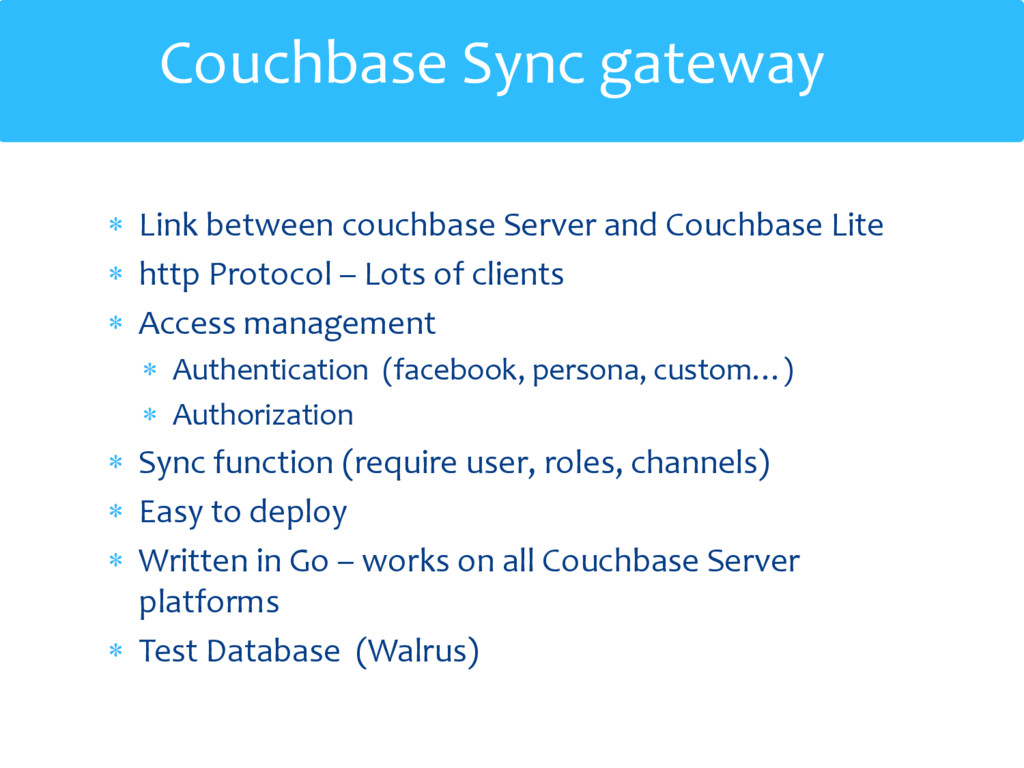 Protocol – Lots of clients Access management Authentication (facebook, persona, custom…) Authorization Sync function (require user, roles, channels) Easy to deploy Written in Go – works on all Couchbase Server platforms Test Database (Walrus) Couchbase Sync gateway