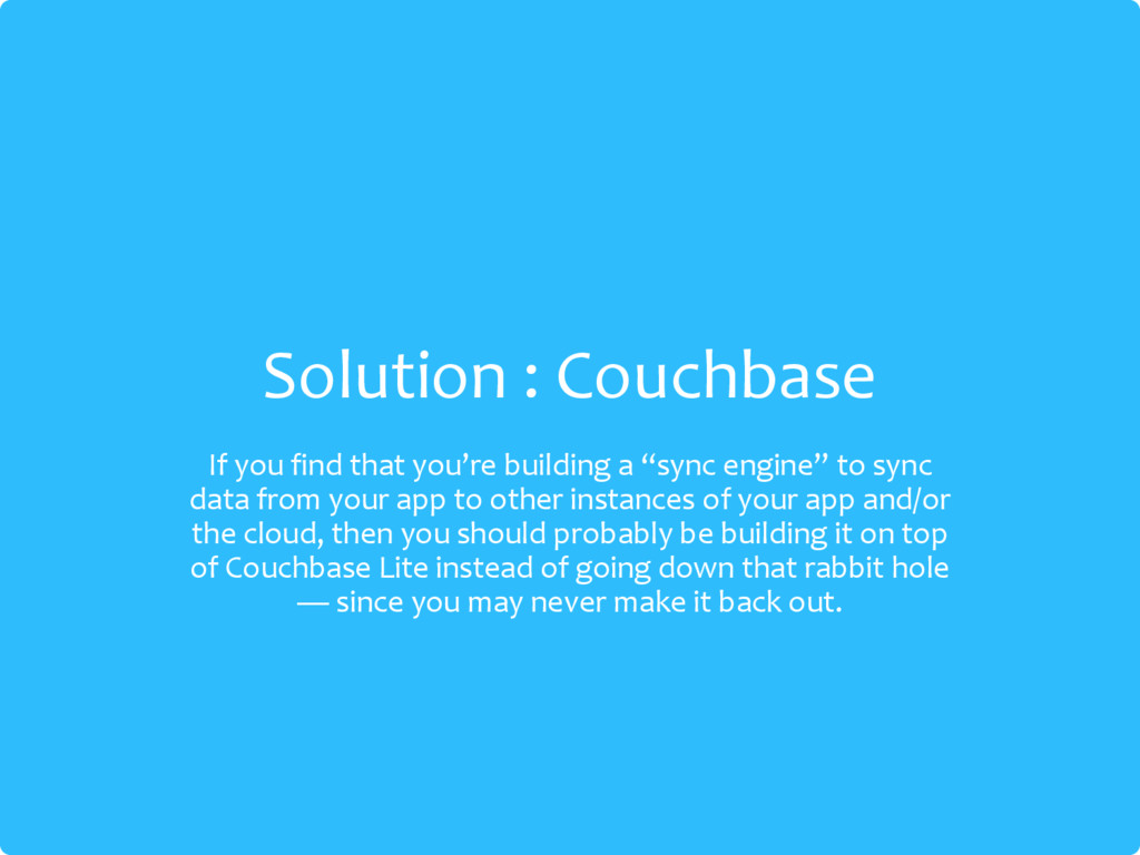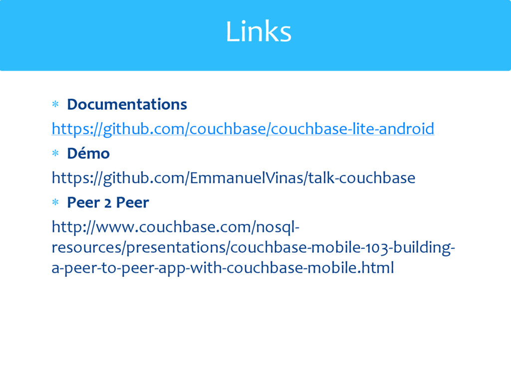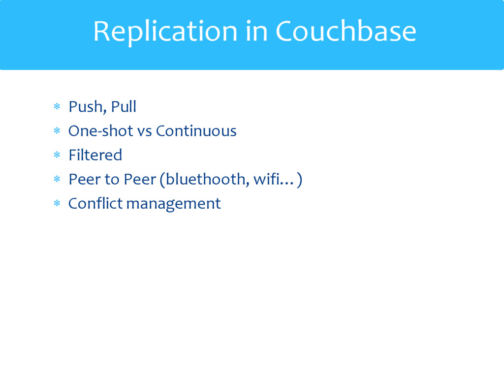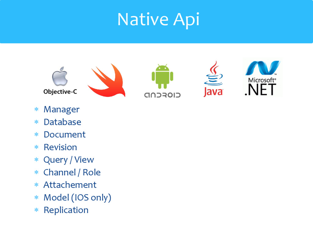 Protocol – Lots of clients Access management Authentication (facebook, persona, custom…) Authorization Sync function (require user, roles, channels) Easy to deploy Written in Go – works on all Couchbase Server platforms Test Database (Walrus) Couchbase Sync gateway