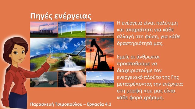 φύση, για κάθε δραστηριότητά μας. Εμείς οι άνθρωποι προσπαθούμε να διαχειριστούμε τον ενεργειακό πλούτο της Γης μετατρέποντας την ενέργεια στη μορφή που μας είναι κάθε φορά χρήσιμη. Πηγές ενέργειας Παρασκευή Τσιμοπούλου – Εργασία 4.1
