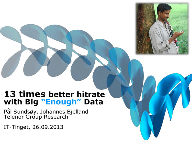 terabytes it sits on, but by the way the company exploits the data in Business! • Answering business questions via data mining and ad hoc analysis • Using pilots and data driven marketing to let the customers tell us what they want • Collaborating with world leading research environments within data science • Petabytes is not a prerequisite - What we need is ‘BIG ENOUGH’ Data for business Telenor is taking steps toward becoming a Big Data company