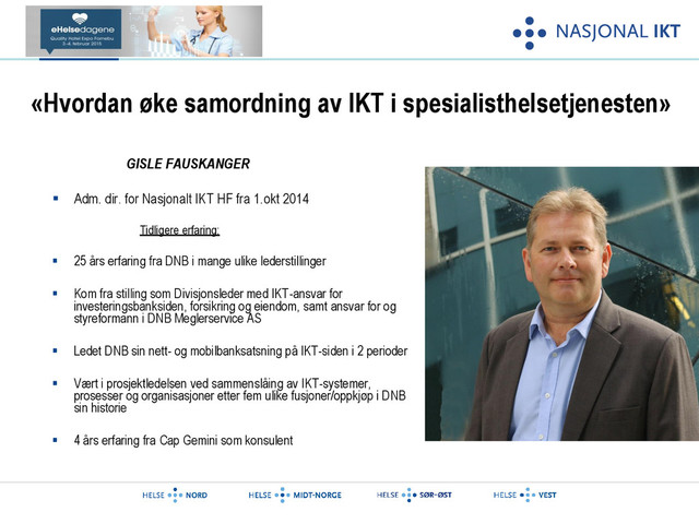funksjonalitet gjennom helsenorge.no-plattformen Støtter behov for informasjon, forberedelser og oppfølging knyttet til avtaler. Tidslinje m/historikk og nye timeavtaler, varsler, henvisninger, sikker dialog for forberedelse/konsultasjon/etterarbeid og reiselogistikk. 1. Avtaler og sikker kommunikasjon med behandlingssted Støtter behov for oversikt over nåværende og tidligere behandlere og tilhørende behandlingssteder: Hvor de er, hvordan de eventuelt kan kontaktes, behandlingstilbud og kvalitet. Oversikten kan suppleres ved egenregistrering. 2. Behandler og behandlingssted Støtter behov knyttet til å se egne journaldokumenter, inkludert tilgangsadministrasjon og logg over bruk. Også tilgang til prøvesvar og informasjon og dialog knyttet til disse. 3. Pasienttilgang til dokumentasjon Støtter behov for opplysninger og oppfølging av egen helse. Strukturerte opplysninger om diagnose, behandlinger, legemidler, symptomer mm. Legemidler m/opplysninger og dialog. Velferdstek./m-helse, egenregistrering og hjemmetester. 4. Helsetilstand og oppfølging Støtter behov for person/situasjonstilpasset informasjon ved utvalg og tilpasning av generell informasjon om diagnoser, behandlinger, øvelser, legemidler, pasient- og støtteorganisasjoner. Symptomsjekker. Oppslagsverk for medisinsk terminologi. Språkverktøy. 5. Personlig kunnskapssenter Støtter behov for oversikt over behandlingsforløp; standard/planlagt forløp så vel som faktisk forløp og status. Beslutningsstøtte ved alternativer. Koordinator/kontaktpunkt; involverte behandlere og roller. 6. Behandlingsforløp Støtter behov for informasjon og veiledning innen rettigheter og prosesser inkl. ved fristbrudd. Støtter også behov for oversikt over egen helseøkonomi; søknader, vedtak, beløpsgrenser, egenandeler. 7. Rettigheter og økonomi Støtter behov for samhandling i grupper innen behandlingsløp og i forbindelse med individuell plan. Grupperom for deling av informasjon; behandlere, innbygger, evt. pårørende. Deltakeradministrasjon. Sikker deling av sensitiv informasjon. 8. Samhandlingsarena Støtter behov for utveksling av strukturert informasjon med innbygger. Definisjon av skjema; versjonering. Skjemautfylling ved gjenbruk/pre-utfylling. Sending og mottak av skjema. 9. Digitale skjema Støtter behov for transport av meldinger mellom innbygger og helsetjenesten, inkl. dokumenter, timeavtaler, resepter, strukturerte data/skjema. Standardiserte meldingsformater m/mulighet for mapping mot ulike løsninger. 10. Samhandlingsplattform/meldingsutveksler (løsningskomponent) Støtter innbyggers behov for å gi fullmakt til at andre kan agere på egne vegne, til å samtykke til innsyn i/utlevering av egne data, og til å regulere sin deltakelse i nasjonale og andre registre inkludert forskning (reservasjon og samtykke). 11. Personverninnstillinger Anbefalte tjenestegrupper for inkludering i nasjonal løsning