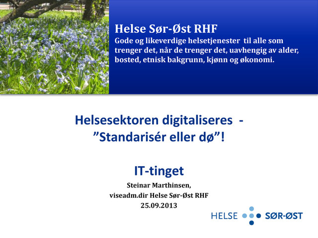 trenger det, når de trenger det, uavhengig av alder, bosted, etnisk bakgrunn, kjønn og økonomi. Helsesektoren digitaliseres - ”Standarisér eller dø”! IT-tinget Steinar Marthinsen, viseadm.dir Helse Sør-Øst RHF 25.09.2013