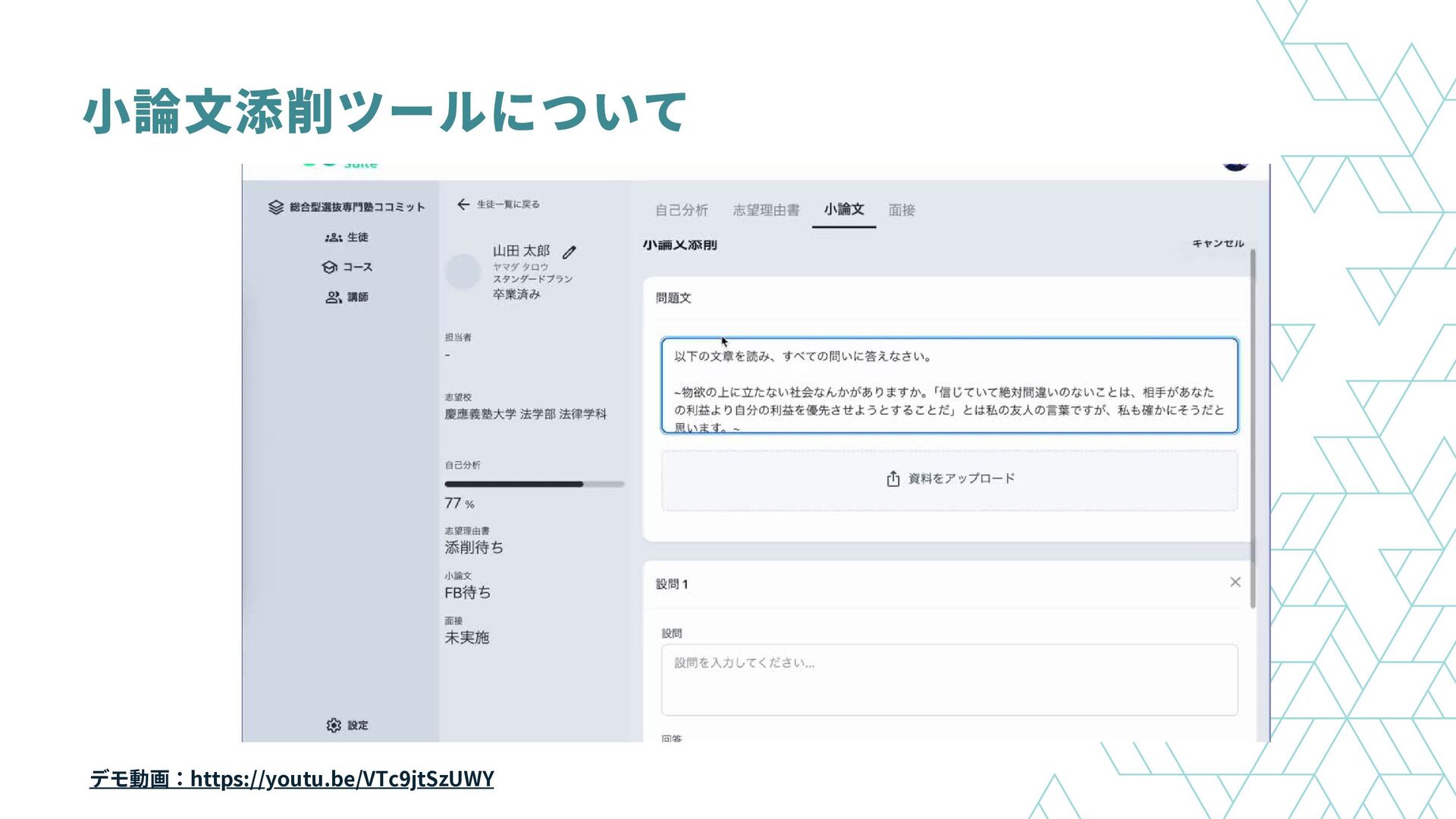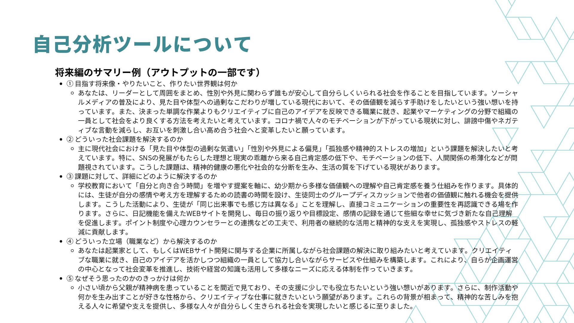 どういった社会課題を解決するのか 主に現代社会における「見た目や体型の過剰な気遣い」 「性別や外見による偏見」 「孤独感や精神的ストレスの増加」という課題を解決したいと考 えています。特に、SNSの発展がもたらした理想と現実の乖離から来る自己肯定感の低下や、モチベーションの低下、人間関係の希薄化などが問 題視されています。こうした課題は、精神的健康の悪化や社会的な分断を生み、生活の質を下げている現状があります。 ③ 課題に対して、詳細にどのように解決するのか 学校教育において「自分と向き合う時間」を増やす提案を軸に、幼少期から多様な価値観への理解や自己肯定感を養う仕組みを作ります。具体的 には、生徒が自分の感情や考え方を理解するための読書の時間を設け、生徒同士のグループディスカッションで他者の価値観に触れる機会を提供 します。こうした活動により、生徒が「同じ出来事でも感じ方は異なる」ことを理解し、直接コミュニケーションの重要性を再認識できる場を作 ります。さらに、日記機能を備えたWEBサイトを開発し、毎日の振り返りや目標設定、感情の記録を通じて些細な幸せに気づき新たな自己理解 を促進します。ポイント制度や心理カウンセラーとの連携などの工夫で、利用者の継続的な活用と精神的な支えを実現し、孤独感やストレスの軽 減に貢献します。 ④ どういった立場(職業など)から解決するのか あなたは起業家として、もしくはWEBサイト開発に関与する企業に所属しながら社会課題の解決に取り組みたいと考えています。クリエイティ ブな職業に就き、自己のアイデアを活かしつつ組織の一員として協力し合いながらサービスや仕組みを構築します。これにより、自らが企画運営 の中心となって社会変革を推進し、技術や経営の知識も活用して多様なニーズに応える体制を作っていきます。 ⑤ なぜそう思ったのかのきっかけは何か 小さい頃から父親が精神病を患っていることを間近で見ており、その支援に少しでも役立ちたいという強い想いがあります。さらに、制作活動や 何かを生み出すことが好きな性格から、クリエイティブな仕事に就きたいという願望があります。これらの背景が相まって、精神的な苦しみを抱 える人々に希望や支えを提供し、多様な人々が自分らしく生きられる社会を実現したいと感じるに至りました。