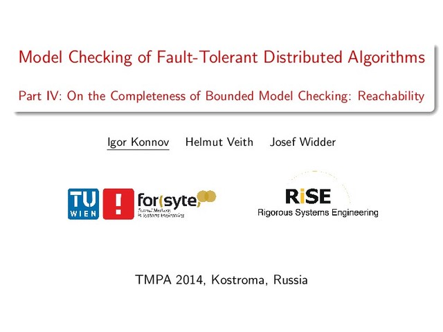 e.g., n = 4, t = 1, f = 1, N = n − f = 3. Fix configurations σ and σ of PN. Question: is σ reachable from σ in PN? Parameterized reachability: Fix properties S and S on configurations, e.g., S : κ1 = N(p) and S : κ4 = 0. Question: are there parameter values p and configurations σ, σ of PN(p): parameters p satisfy the resilience condition RC(p), σ |= S and σ |= S , σ is reachable from σ in PN(p). Igor Konnov 27/72