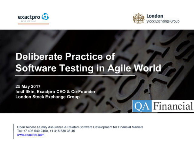 May 2017 Iosif Itkin, Exactpro CEO & Co-Founder London Stock Exchange Group Open Access Quality Assurance & Related Software Development for Financial Markets Tel: +7 495 640 2460, +1 415 830 38 49 www.exactpro.com