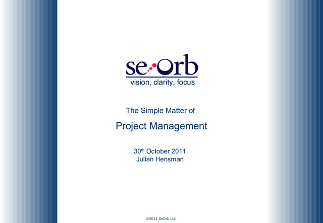 Starter for 10 Standish Group 2006 CHAOS Survey: 67% of all IT projects fail • Use a “system” that promotes simple process and take time to set it up properly! • Is a project a democracy? Reporting line: Army & General • As simple as possible • Review time – plan it (fixed duration)! • Contingency – schedule vs. budget – keep them separate • Plan Activities – between 2 and 20 days • 100 Lessons Learned by Jerry Madden, Goddard Space Flight Center http://askmagazine.nasa.gov/issues/14/practices/ask14_lessons_madden.htm • Objective based rewards. If you reward for delivering on time, do not expect Quality • Keep your Stakeholders interested • Communication, communication, communication SeOrb – Vision. Clarity. Focus