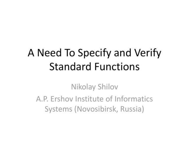 specification and validation of standard functions is well-recognized by industrial and academic professional community as well as the problem of conformance of their implementation with the specification 11/13/2015 20 N.Shilov -TMPA-2015 talk