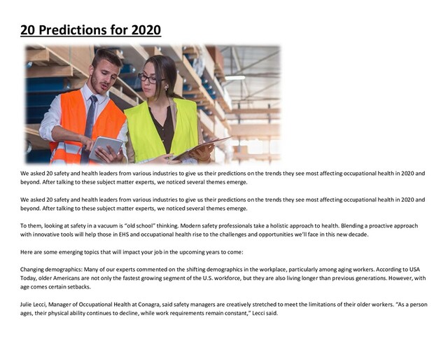 leaders from various industries to give us their predictions on the trends they see most affecting occupational health in 2020 and beyond. After talking to these subject matter experts, we noticed several themes emerge. We asked 20 safety and health leaders from various industries to give us their predictions on the trends they see most affecting occupational health in 2020 and beyond. After talking to these subject matter experts, we noticed several themes emerge. To them, looking at safety in a vacuum is “old school” thinking. Modern safety professionals take a holistic approach to health. Blending a proactive approach with innovative tools will help those in EHS and occupational health rise to the challenges and opportunities we’ll face in this new decade. Here are some emerging topics that will impact your job in the upcoming years to come: Changing demographics: Many of our experts commented on the shifting demographics in the workplace, particularly among aging workers. According to USA Today, older Americans are not only the fastest growing segment of the U.S. workforce, but they are also living longer than previous generations. However, with age comes certain setbacks. Julie Lecci, Manager of Occupational Health at Conagra, said safety managers are creatively stretched to meet the limitations of their older workers. “As a person ages, their physical ability continues to decline, while work requirements remain constant,” Lecci said.